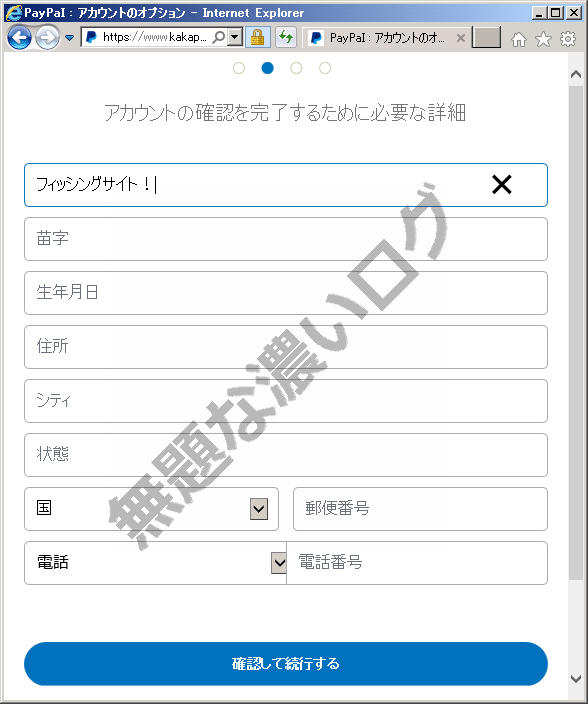 デタラメな情報を送信して先へ進めてみると、個人情報を入力して送信するよう要求する画面に変遷しました。