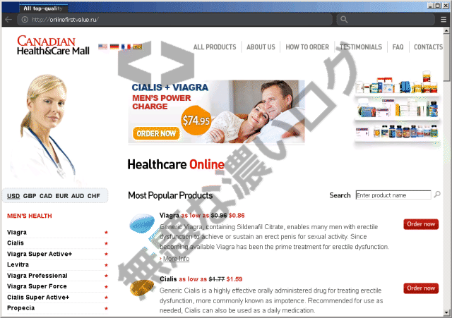 英語の場合、たいてい Canadian Pharmacy (カナダ薬局) と称した怪しい通販サイトに誘惑することが狙いです。