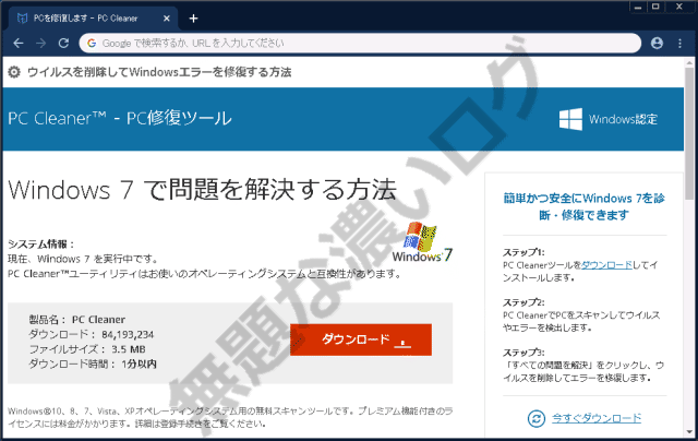 こうして、PC Cleaner (PCクリーナー) のダウンロードページへたどり着くパターンを手元で確認しています。
