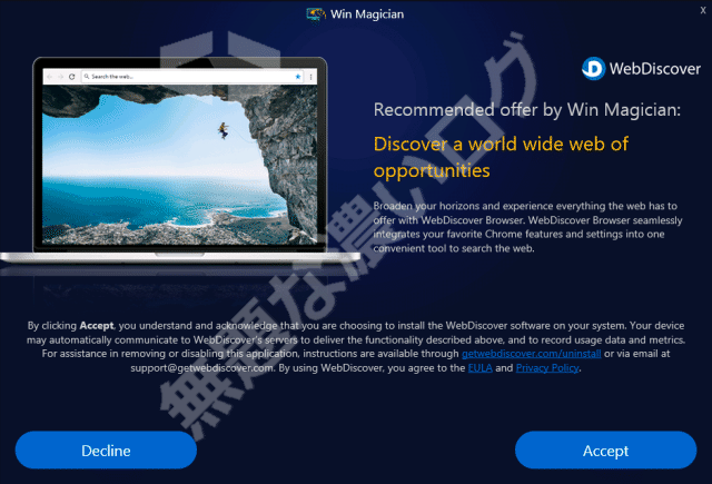 そんな WebDiscover の導入経路の1つとして、海外系フリーソフトで採用されてる インストーラ に表示された WebDiscover ブラウザの同時導入提案シーンがコレ♪