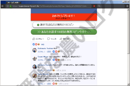 ネットサーフィン中、リダイレクト型広告コンテンツにより勝手に誘導されて出会った怪しい日本語ページ 「フリースピンを獲得」 にご注意下さーい。