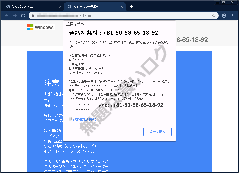 重要な情報 通話料無料 : +81-50 *** エラー # AP7MQ79. *** 疑わしいアクティビティが原因でWindowsがブロックされました 次の情報が失われる可能性があります。 無題な濃いログ 1. パスワード 2. 閲覧履歴 3. 機密情報(クレジットカード) 4. ハードディスク上のファイル 無題な濃いログ この重大な警告を無視しないでください。 このページを閉じると、コンピューターへのアクセスが無効になり、ネットワークへのさらなる損害を防ぎます 電話してください: +81-50 すぐにご連絡ください。当社の技術者が電話の取り外し手順をご案内します。 コンピューターが無効になるのを防ぐために、5分以内に電話してください。電話番号: +81-502 無題な濃いログ 追加の対話を防ぐ 安全に戻る