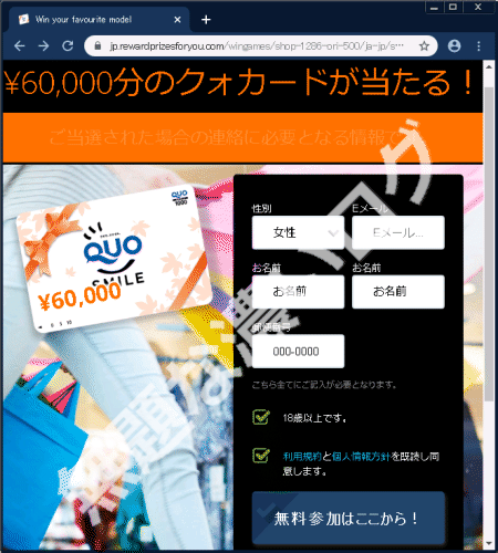 手元では 「\60,000分のクォカードが当たる!」 として、コチラの素性を尋ねる場面へと誘導されました。