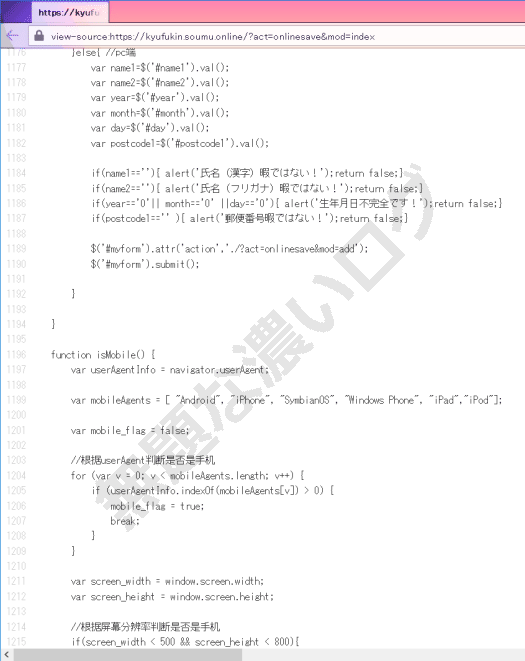 そんなフィッシングサイト 「総務省 特別定額給付金のオンライン申請する特設サイト」 の HTML ソースコードなどを調査すると、日本国内では使わない お隣の大陸の漢字 が複数目に飛び込んできます。