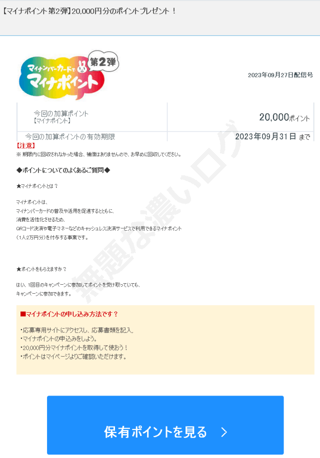 ※期限内に回収されなかった場合、補償はありませんので、お早めに回収してください。無題な濃いログ◆ポイントについてのよくあるご質問◆★マイナポイントとは?マイナポイントは、マイナンバーカードの普及や活用を促進するとともに、消費を活性化させるため、QRコード決済や電子マネーなどのキャッシュレス決済サービスで利用できるマイナポイント(1人2万円分)を付与する事業です。★ポイントをもらえますか?はい、1回目のキャンペーンに参加してポイントを受け取っていても、キャンペーンに参加できます。■マイナポイントの申し込み方法です?・応募専用サイトにアクセスし、応募書類を記入,