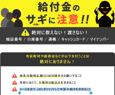 特別定額給付金、緊急支援給付金、マイナポイントを騙る迷惑メール本文例