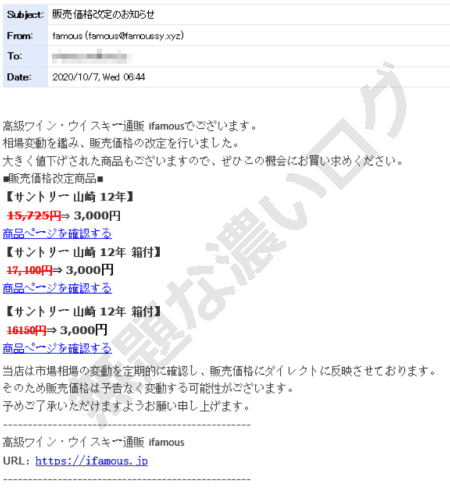 <迷惑メール>ifamous.jp販売価格改定のお知らせワイン通販怪しい