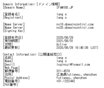 そのドメイン保有者を WHOIS 検索すると、登録名は 「lang o」 なる外国人でしょうか。