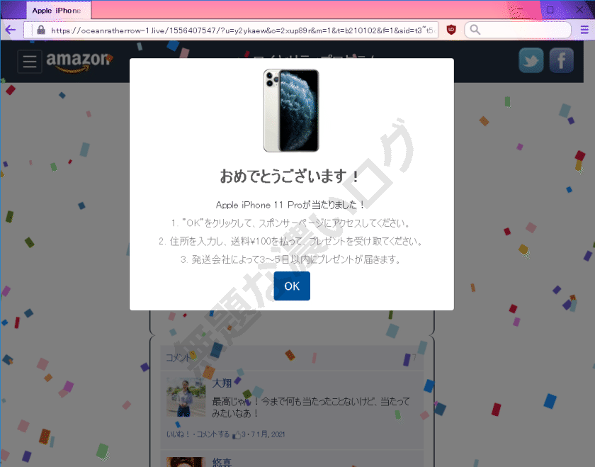 登場するアマゾンやアップルは、プレゼント当選といっさい無関係で、赤の他人が有名ブランドを悪用する 詐欺 です。