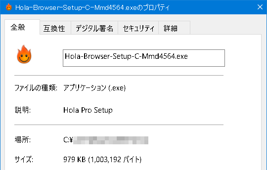 ヒヤッとするのが 2 つ目のパターンで、手元の Windows パソコンでダウンロードを促されたのが、「Hola-Browser-Setup ~」 という実行ファイル (拡張子 .exe) なのでした。