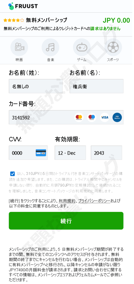 怪しいサービス Fruust を宣伝する広告からクレジットカード情報を登録しないでください。