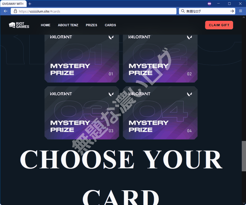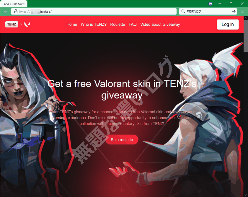 <TenZ とのスキン配布コラボを騙る VALORANT 偽サイトの表示メッセージ例>
