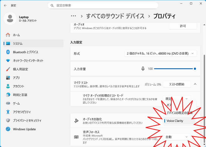 ■ マイク設定で 「Voice Clarity」 を有効化できる