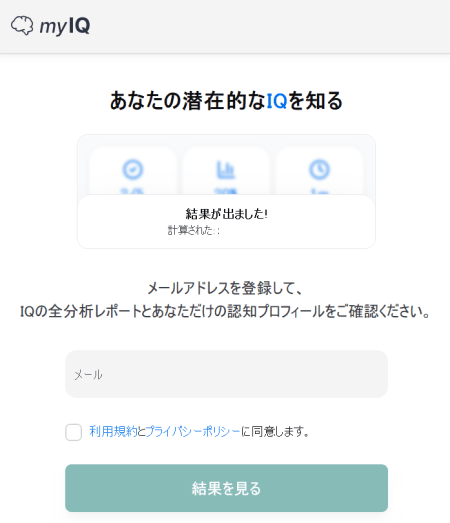 【myIQ トップ画面】結果は登録者のみご利用いただけます。このテストは教育および娯楽を目的としたものであり、専門的な評価ではありません。